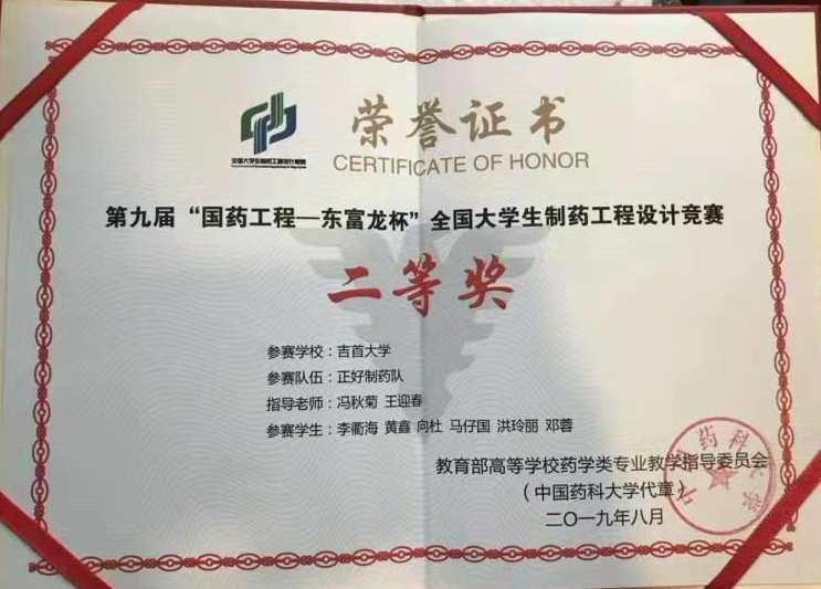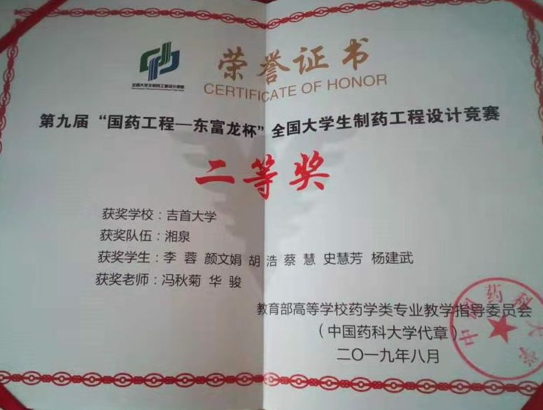 2022年:第十届挑战杯湖南省老员工创业计划竞赛铜奖、第十届全国老员工制药工程设计竞赛二等奖