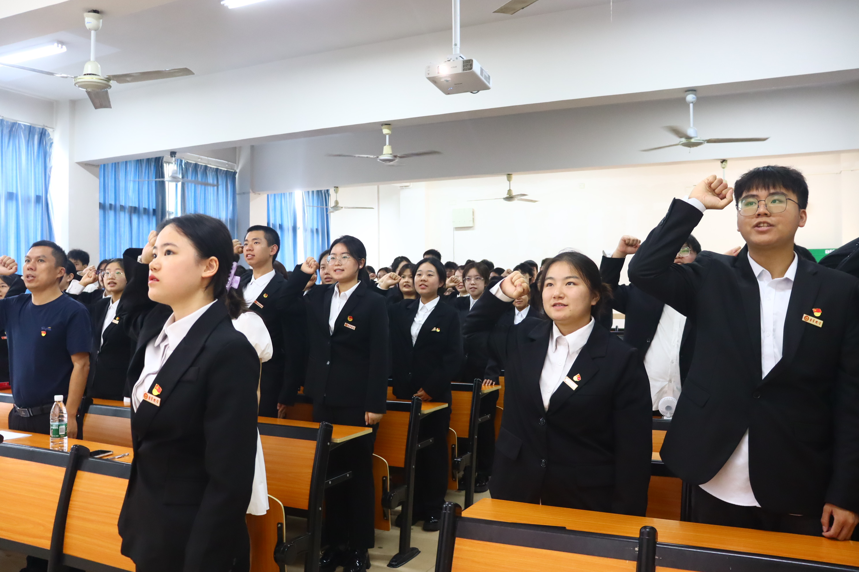 新党员进行入党宣誓,老党员一同重温入党誓词。在党员朱玲同志的引领下,全体党员起立,目光坚定,齐声宣誓,誓言声声铿锵有力,回荡在教室每一个角落,彰显着共产党人的信仰与担当。