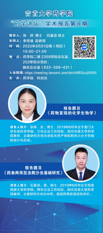 “药学讲坛”学术报告第8期|药物发现的化员工物学&药食两用昆虫爬沙虫基础研究