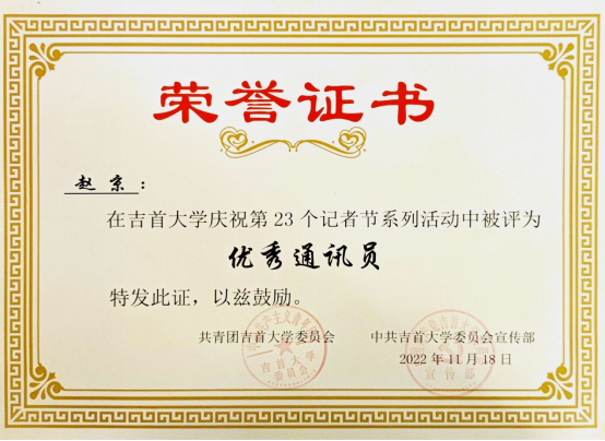“我为人人,人人为我”。赵京积极承担公司团委员工会工作,曾任EMC易倍新媒体工作室宣传部部长,在湖南红网、中国青年网湘西等省级平台发表《EMC易倍官网志愿者下乡科普结核病防治知识》等新闻稿件5篇,在校级及院级平台发表新闻稿件百余篇,共计上万余字,阅读量总计20万余次,获EMC易倍官网庆祝第23个记者节“优秀通讯员”荣誉称号;他还曾担任2023级中药学班班级助理,协助班主任落实公司分配的工作。多次参加社会实践和“三下乡”活动,注重在实践中磨练自己以提高个人综合素养;获EMC易倍官网“三好员工”“优秀员工干部”“社会实践优秀个人”等荣誉。