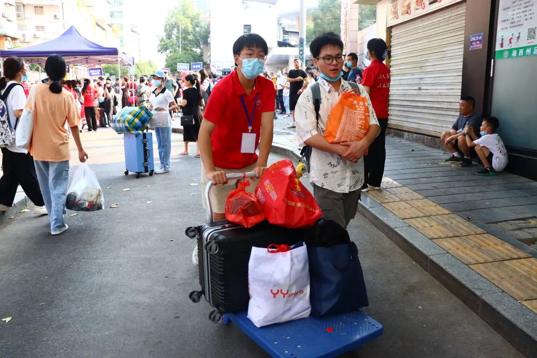 因疫情防控需要,送人车辆及亲友无法入校,且大部分新生携带物品较多,为协助新生顺利完成报到工作,40余名志愿者奔波于校门与报到处之间。早晨七点多,志愿者就忙碌起来了,第一时间接过新生的行李前往报到处,在途中,不忘提醒他们准备好录取通知书等相关文件。报到处的志愿者有条不紊,仔细核对同学入学信息,并指引其领取军训服装,前往大田湾校区。报到现场井然有序,贴心的入学“一站式”服务让新生省时省力,大大提高了报到效率。
