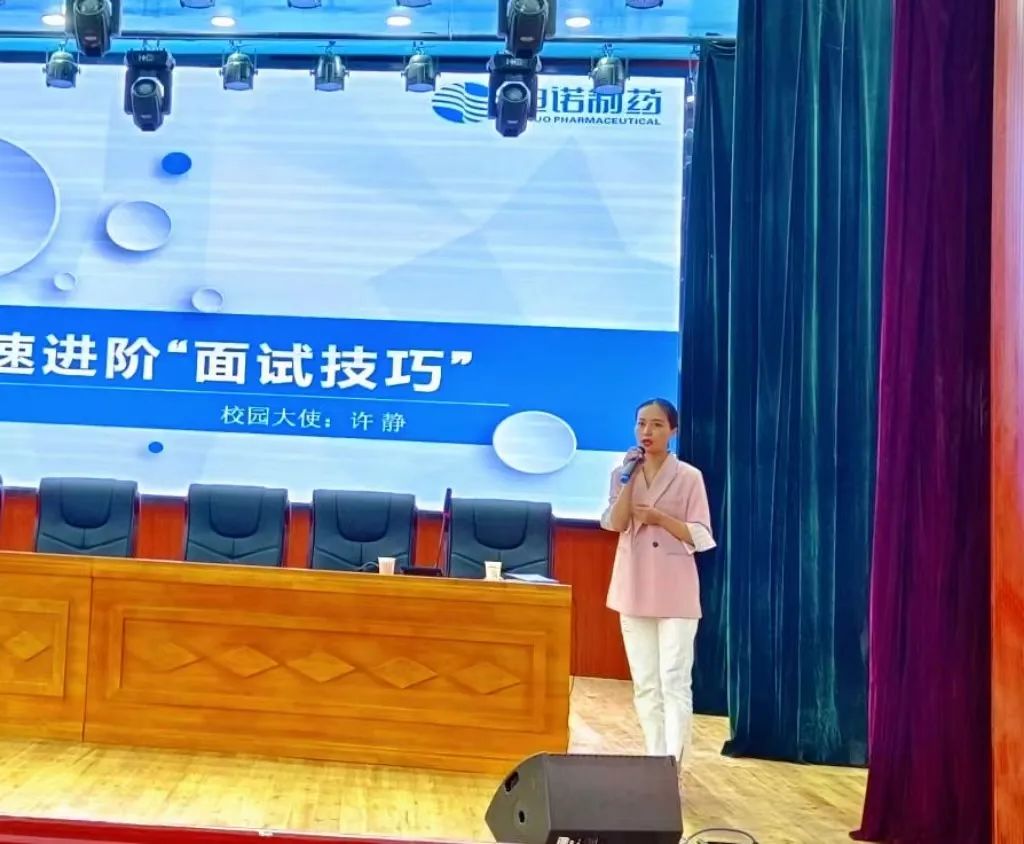 图为 迪诺制药许静为EMC易倍员工分享求职经验