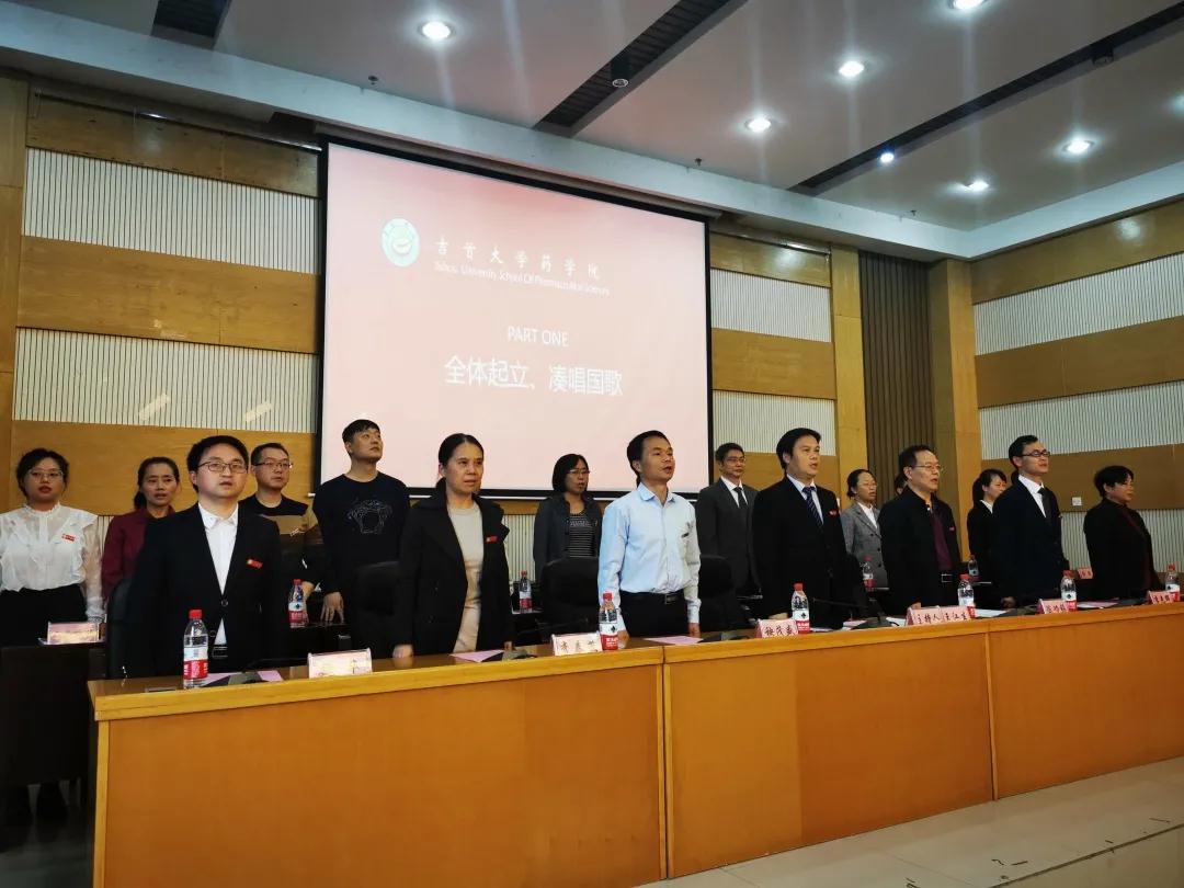 图为 全体教师起立奏唱国歌