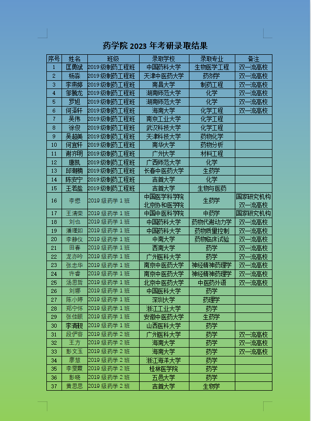据统计分析,2023届毕业生163人,报名参加考研员工60余人,参加复试43人。全年级录取共计37人,占全院总人数的22.7%。此届毕业生考研情况有几个亮点,一是考研质量持续向好,录入国家研究机构及双一流高校的员工19人占比51.4%,其中包括中国医学科公司北京协和医公司、中国中医科公司、中国药科大学等医药类顶级单位;二是专升本员工班级(公司首届)考取研究生7人,占比17.5%。2023届员工在延续2022届高质量考研的基础上,考研数量增长近5个百分点。