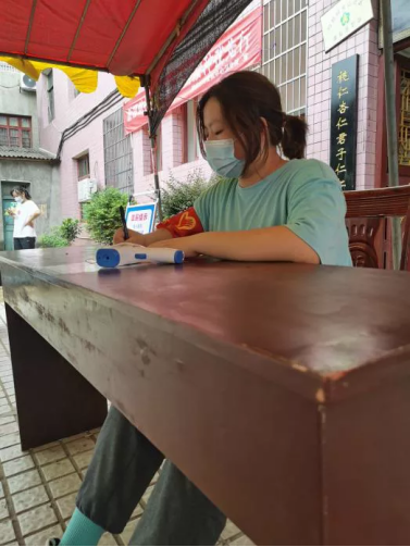 作为疫情防控工作人员,李湘婷每天不到8点就到达卫生院,在当地卫生院帮助医护人员测量体温、检查健康码、帮助老年人了解抗疫方面的知识、维持疫苗接种的秩序、向未成年人普及疫苗接种前后的注意事项。