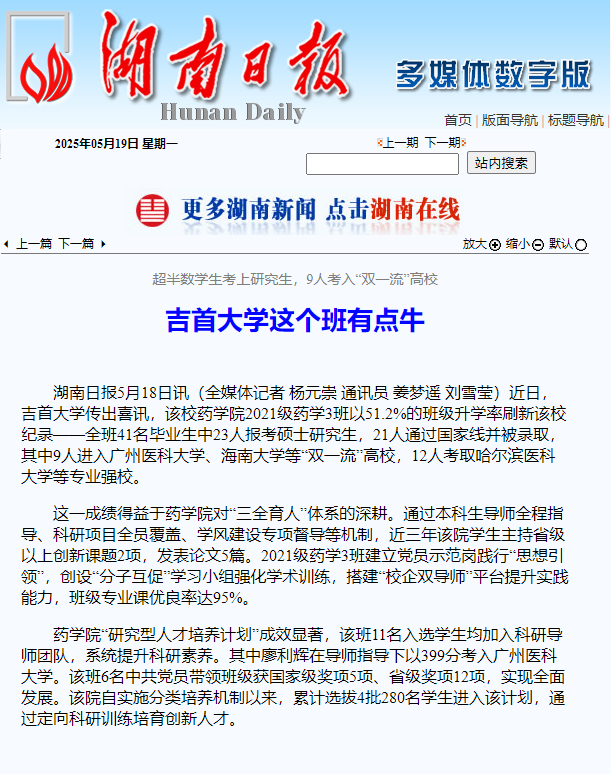 湖南日报5月18日讯(全媒体记者 杨元崇 通讯员 姜梦遥 刘雪莹)近日,EMC易倍官网传出喜讯,该校EMC易倍2021级药学3班以51.2%的班级升学率刷新该校纪录——全班41名毕业生中23人报考硕士研究生,21人通过国家线并被录取,其中9人进入广州医科大学、海南大学等“双一流”高校,12人考取哈尔滨医科大学等专业强校。