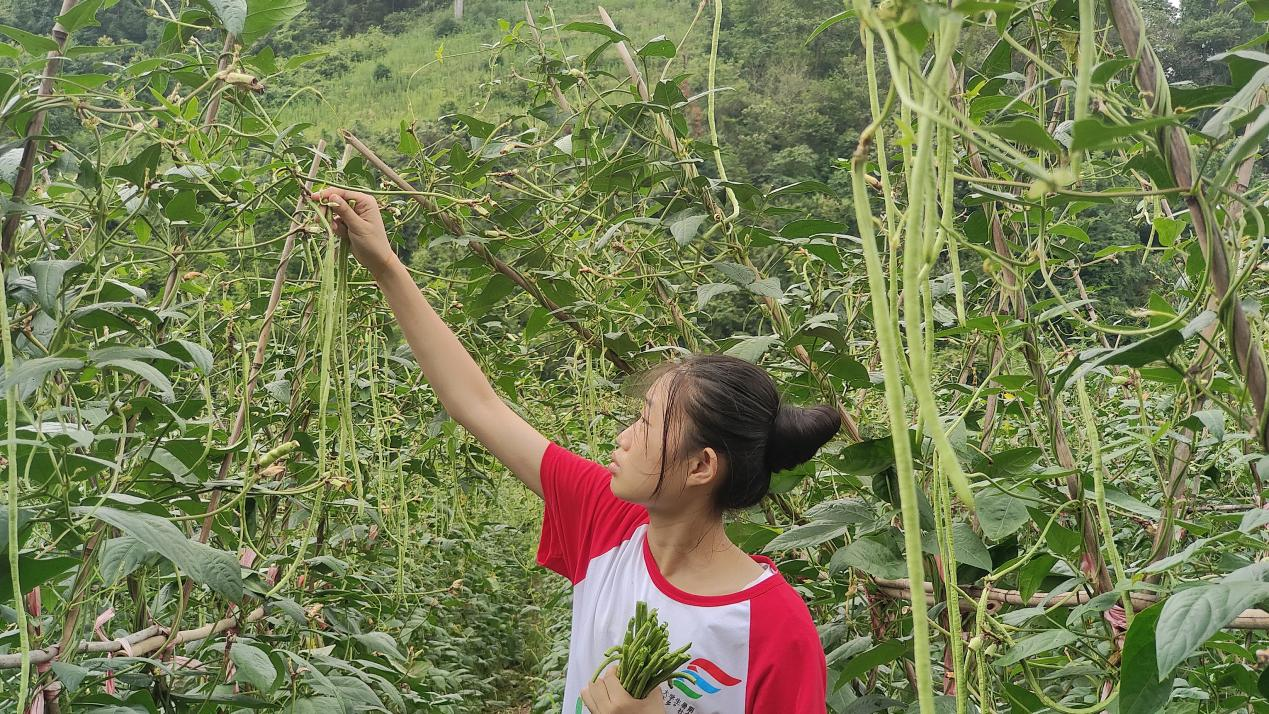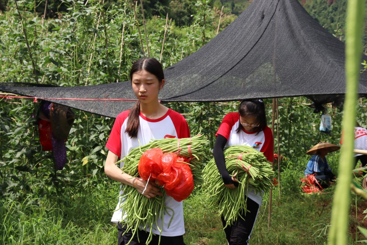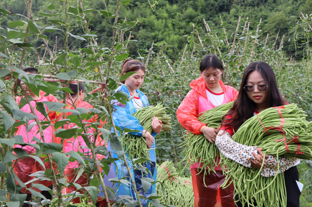 7月,中寨村正值豇豆丰收的季节,豇豆地里一片繁忙和喜悦的氛围。村民们热情地为志愿者们讲解采摘豇豆的方法和技巧。沐浴着阳光,穿梭在豆藤架之间,不一会,一捆捆的豇豆堆得便有小山丘那么高。