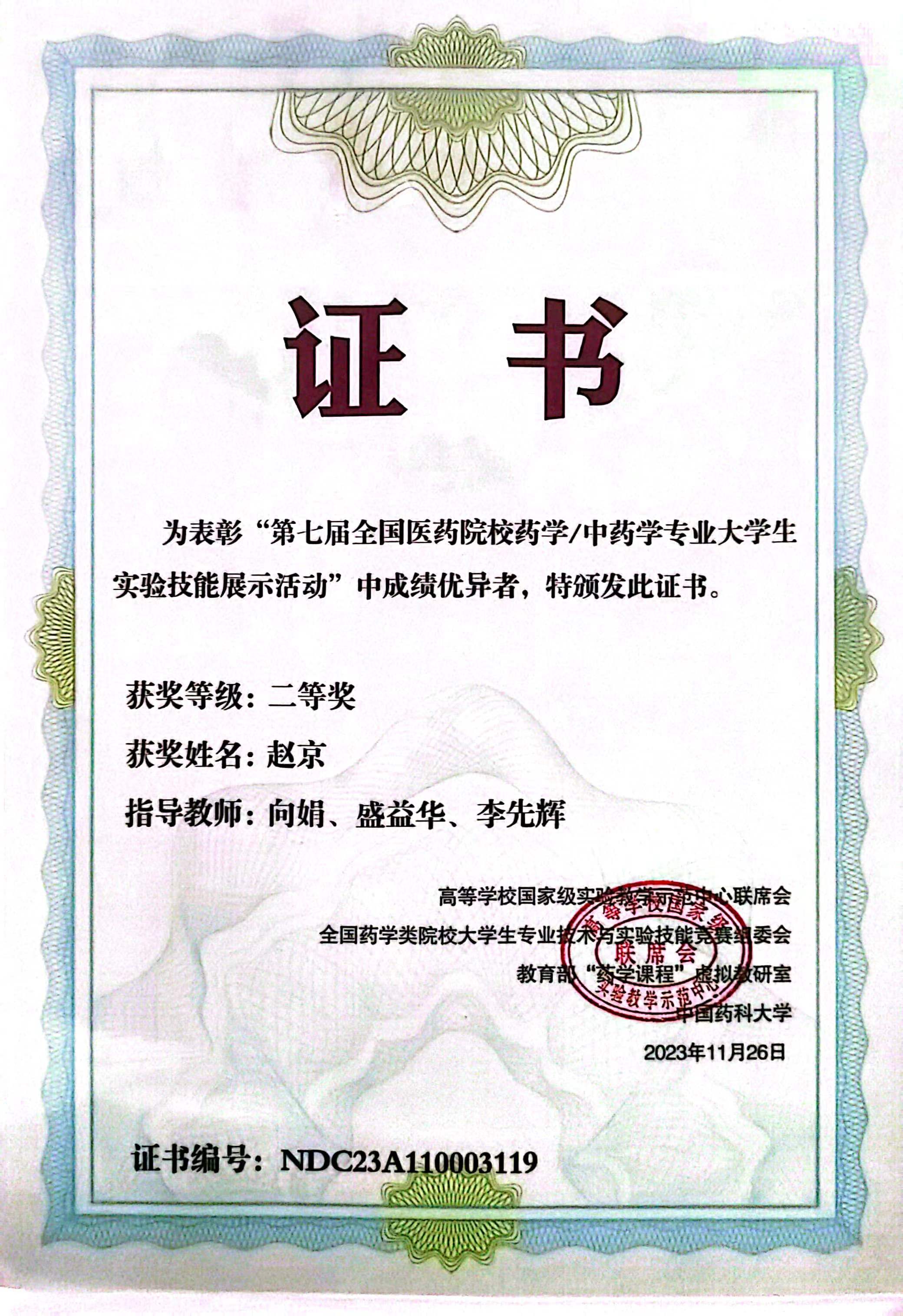 本网讯(通讯员 周岑妃)11月25-26日,第七届全国医药院校药学/中药学专业老员工实验技能竞赛活动在遵义医科大学顺利举行,公司药学专业2021级赵京同学不负众望荣获全国二等奖。药学系主任盛益华老师、中药系主任向娟老师作为指导老师带队前往参赛并作全程指导。