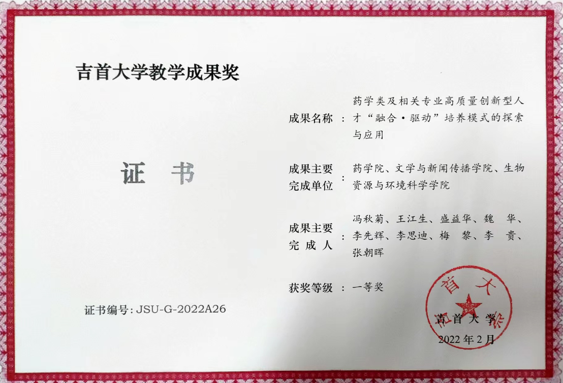 两项成果中,由EMC易倍牵头,文公司、生物资源与环境科学公司参与联合申报的《药学类及相关专业高质量创新型人才“融合·驱动”培养模式的探索与应用》获本科教育校级教学成果一等奖,主要完成人为:冯秋菊、王江生、盛益华、魏华、李先辉、李思迪、梅黎、李贵、张朝晖。公司参与(生物资源与环境科学公司牵头)联合申报的《基于“两山理论”的武陵山区高校生态学研究生创新人才培养体系探索与实践》喜获学位与研究生教育组教学成果一等奖,主要完成人为:周强、陈功锡、谭敦炎、聂泽龙、彭清忠。