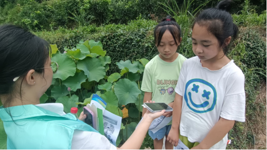 图为 志愿者与向当地小员工进行防溺水知识科普