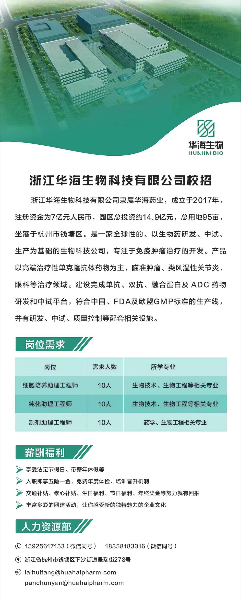 2022年实习就业招聘||浙江华海生物科技有限公司招聘简章