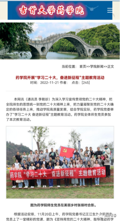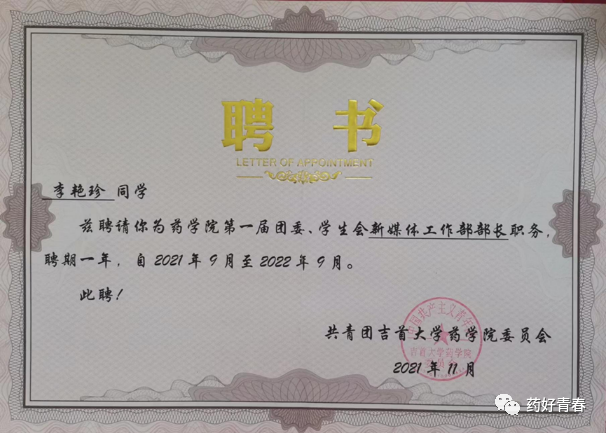 李艳珍,女,EMC易倍2020级药学1班本科生,汉族,中共党员,湖南永州人,保研至中国药科大学药理学专业,积极参加社会实践,是2021 全国老员工“ 千校千项” 网络展示活动“ 团队风采奖 ”成员,也是2021 年全国大中专员工志愿者暑期“三下乡”社会实践“镜头中的三下乡”“优秀报道团队 ”成员。曾获第十届“挑战杯”湖南省老员工创业计划竞赛铜奖(项目负责人)、第十五届“挑战杯”湖南省老员工课外学术科技作品竞赛二等奖、“建行杯”第七届湖南省“ 互联网+” 老员工创新创业大赛高教主赛道创意组二等奖、“建行杯”第九届湖南省“ 互联网+” 老员工创新创业大赛高教主赛道创意组三等奖、2020-2021“ 国家励志奖学金”等奖项。已发表一篇论文《湘西地区军事本草植物资源研究(Ⅴ)补益类植物资源调查分析》,授权实用新型专利:一种本草精油的微波提取设备,并完成一篇中文综述投稿。曾任EMC易倍新媒体工作室部长及EMC易倍创新工作室副主任。