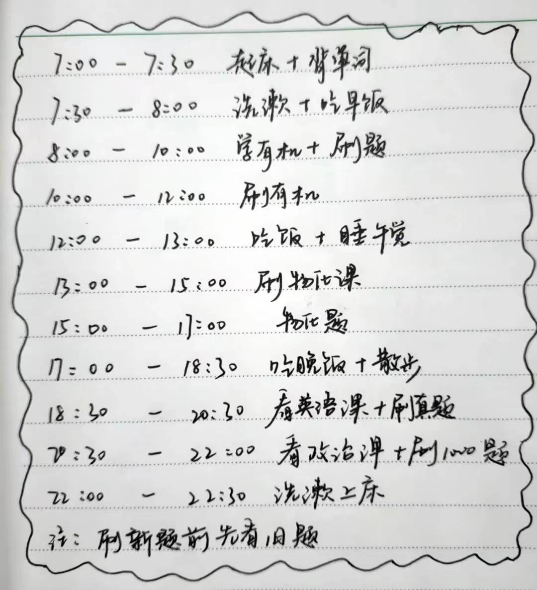 2023年是张思佳全身心投入备考的一年。备考前期,早上刷专业课的题,晚上复习政治和英语,后期早上背政治的大题,刷英语题,晚上则安排专业课的复习。三点一线,日日重复。